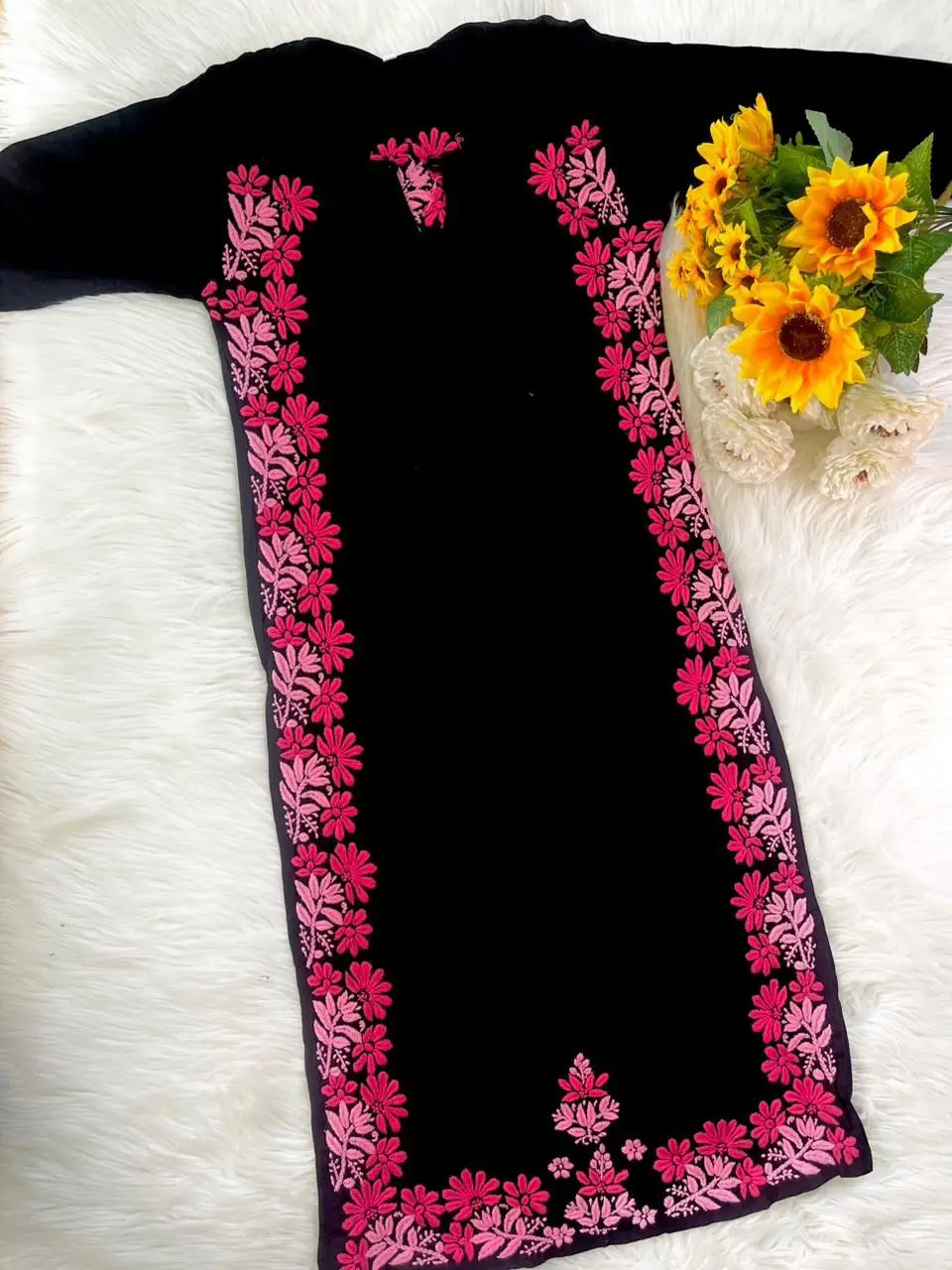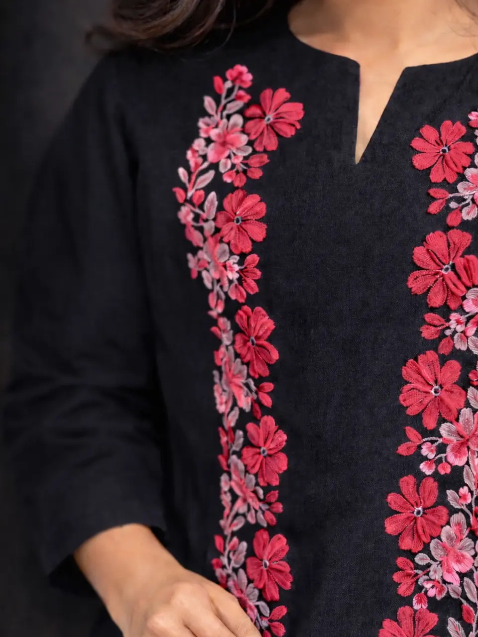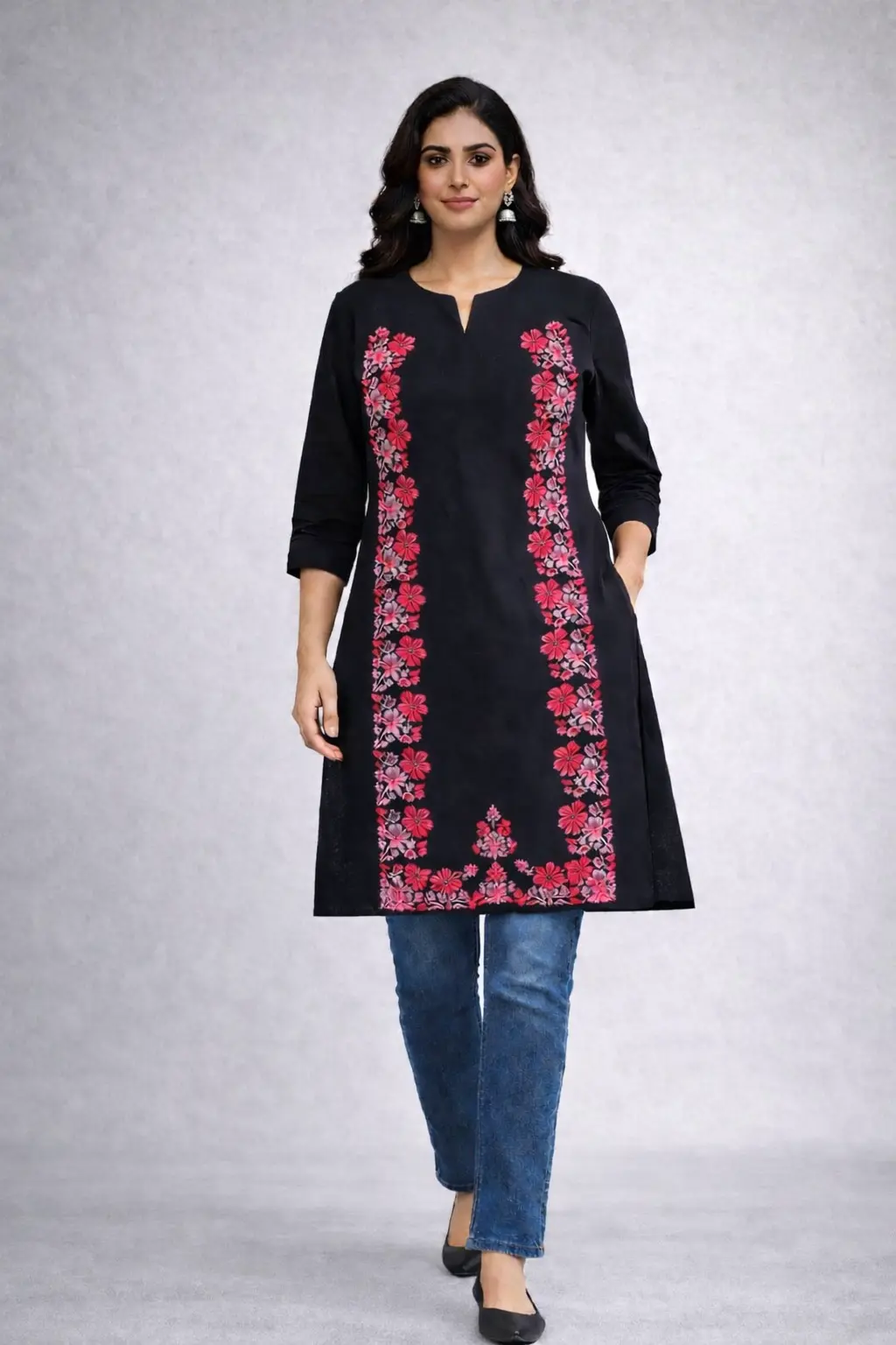 Upgrade your everyday office style with this elegant Black Floral Embroidered Kurti, designed for comfort and sophistication. Crafted from premium rayon fabric, this kurti offers a soft, breathable feel that keeps you comfortable throughout the day. The beautiful pink floral embroidery on the front panel adds a stylish and graceful touch, making it perfect for both corporate wear and casual outings.
