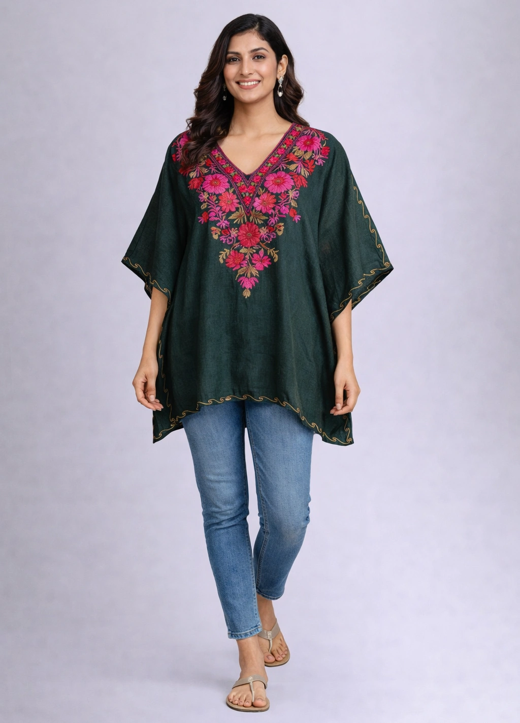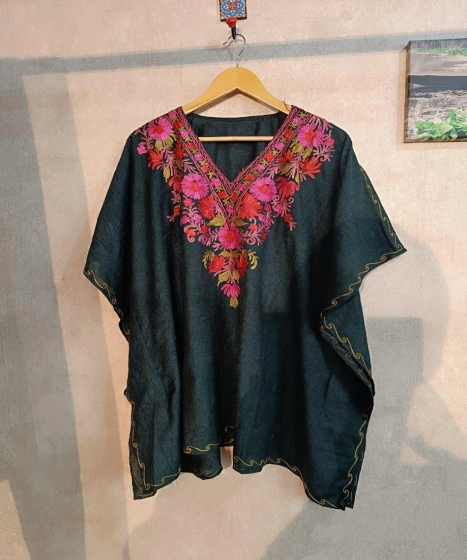 Upgrade your wardrobe with this elegant Crush Cotton Kaftan Top from Kashmir Treasuries. Designed with premium quality crush cotton fabric, this black embroidered kaftan top offers a perfect blend of comfort, breathability, and style. The beautiful multi-color embroidery enhances its ethnic appeal, making it suitable for daily wear, casual outings, festive occasions, and summer styling.