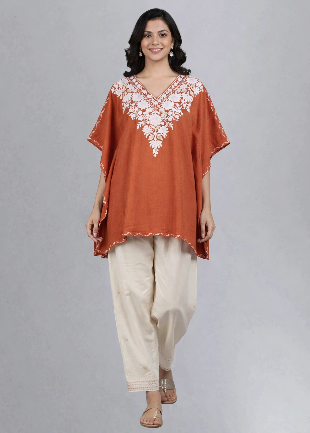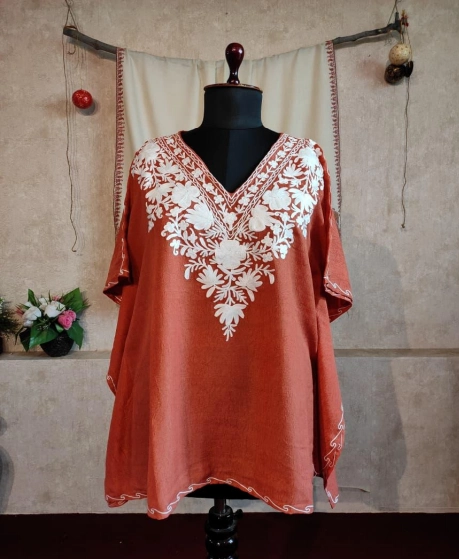 Upgrade your wardrobe with this elegant Crush Cotton Kaftan Top from Kashmir Treasuries. Designed with premium quality crush cotton fabric, this rust embroidered kaftan top offers a perfect blend of comfort, breathability, and style. The beautiful white embroidery enhances its ethnic appeal, making it suitable for daily wear, casual outings, festive occasions, and summer styling.
