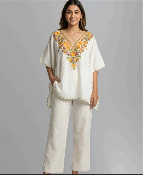 Upgrade your wardrobe with this elegant Crush Cotton Kaftan Top from Kashmir Treasuries. Designed with premium quality crush cotton fabric, this white embroidered kaftan top offers a perfect blend of comfort, breathability, and style. The beautiful multi-color embroidery enhances its ethnic appeal, making it suitable for daily wear, casual outings, festive occasions, and summer styling.