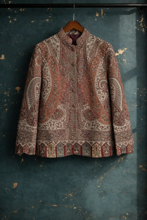 The featured designs showcase elaborate paisley patterns. Each jacket displays meticulous attention to pattern placement, with ornate border work adorning the lower panels and cuffs.