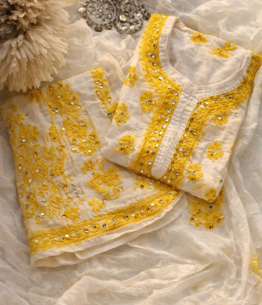 Be the first to review “Yellow Spray Printed Mirror work Chikankari Kurta and Palazzo Set with Dupatta with Inner”