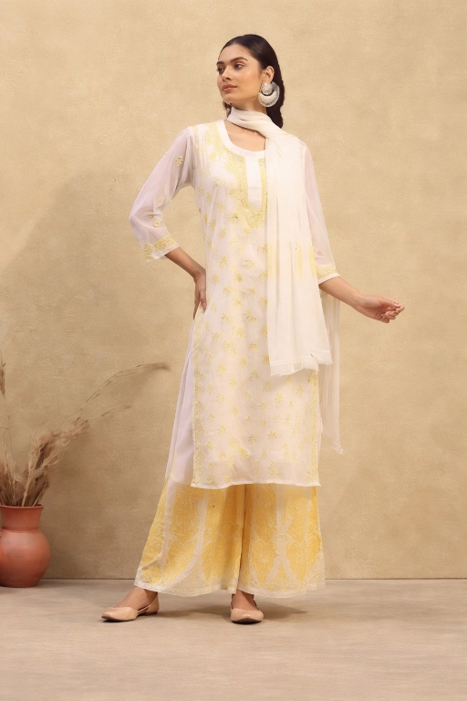 Yellow Spray Printed Mirror work Chikankari Kurta and Palazzo Set with Dupatta with Inner